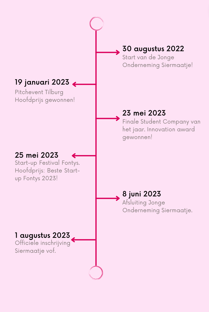 Bekijk onze tijdlijn om de mijlpalen van Siermaatje als Jonge Onderneming te ontdekken, inclusief onze officiële inschrijving bij de KVK op 1 augustus 2023!